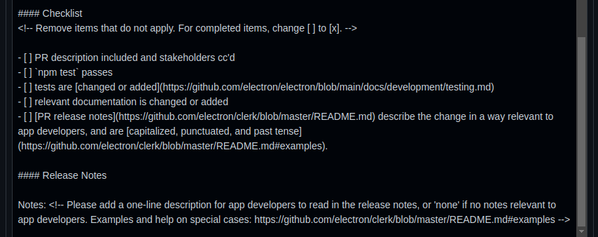 Some repositories provide template content for the PR description, and they include a checklist of items to ensure all contributors adhere to their process and format. Pay attention to any special instructions you’ve been given.