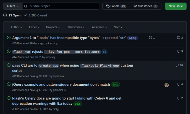 Most projects keep a list of known issues. You can find a task that fits your knowledge and experience level. For example, the list of issues for Flask shows the following: