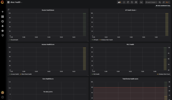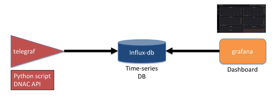 The only real work I need to do is write a small python script to plug into telegraf to collect network and user health data from Cisco DNA Center and convert it to a simple JSON format.