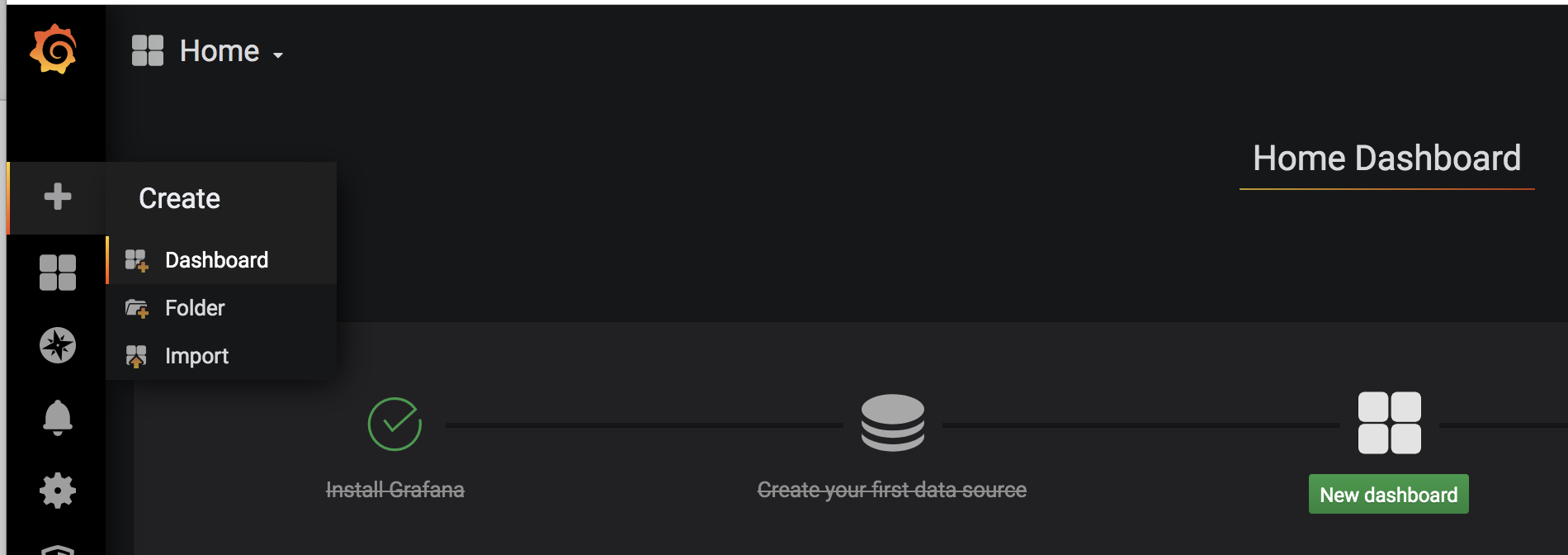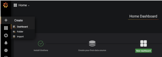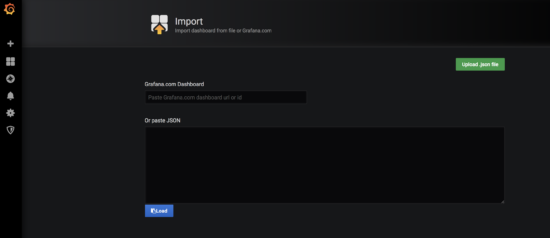 First browse to gafana homepage (typically port 3000). The select “+” -> create -> import