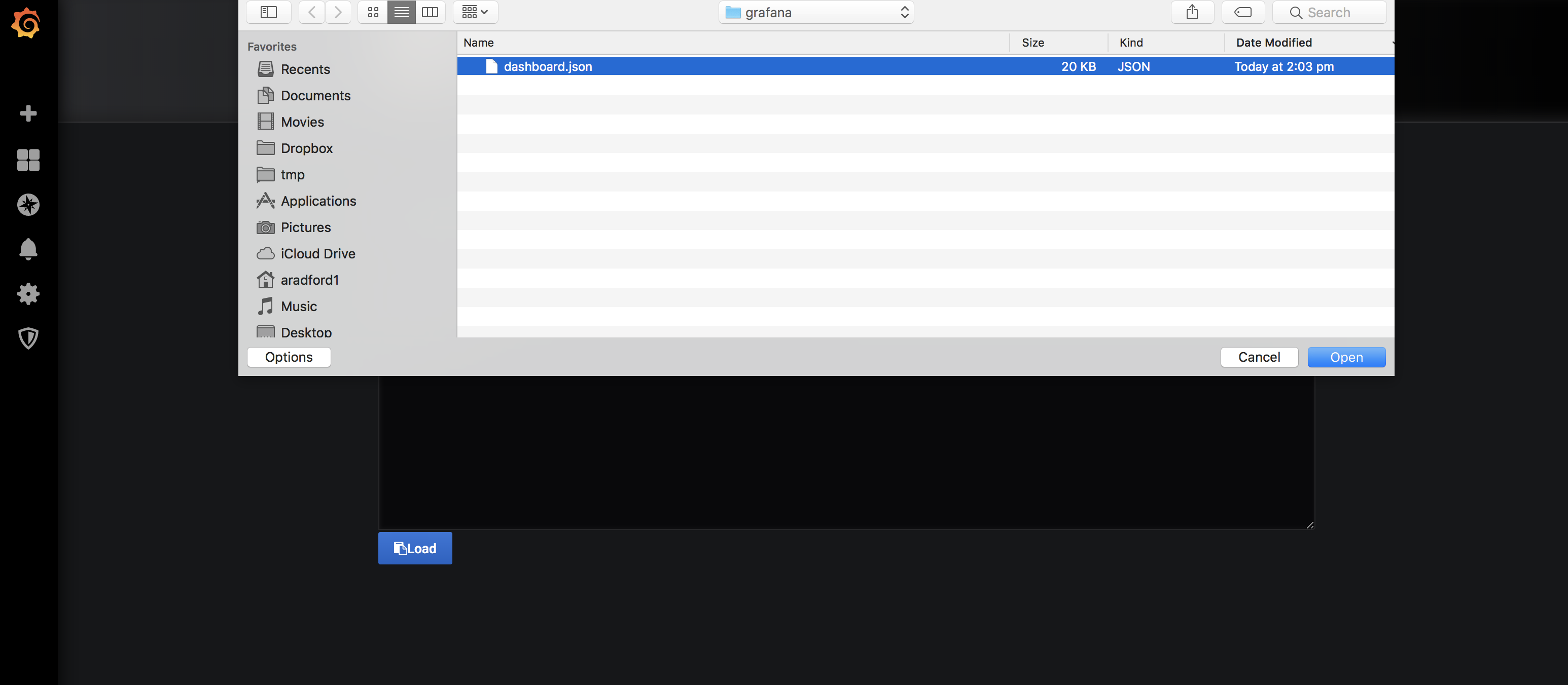The select “grafana/dashboard.json” from the files you downloaded from GitHub.