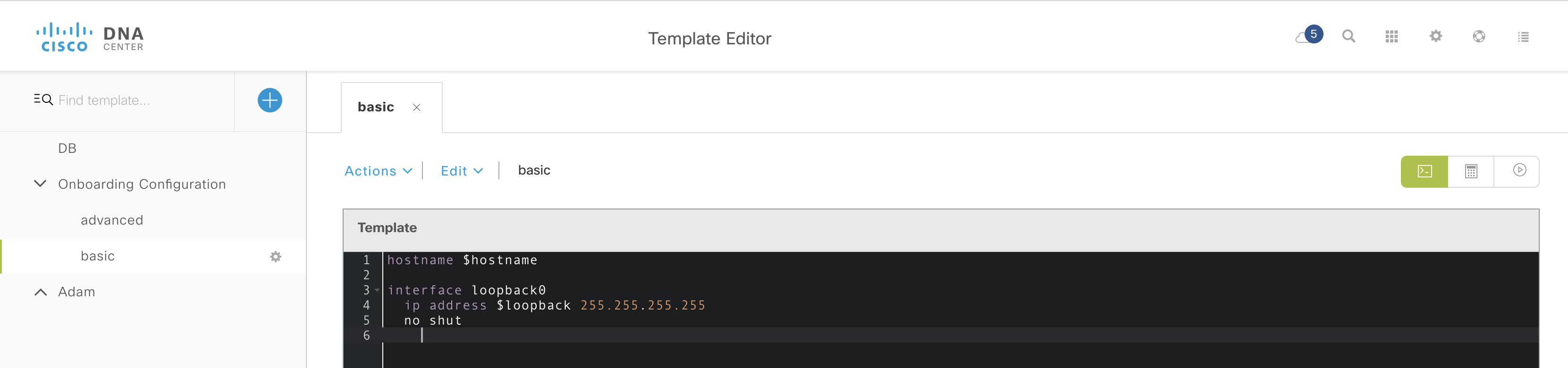 Here is an example of a very simple template. Make sure you both save AND commit the template. The template below has two variables, $hostname and $loopback.
