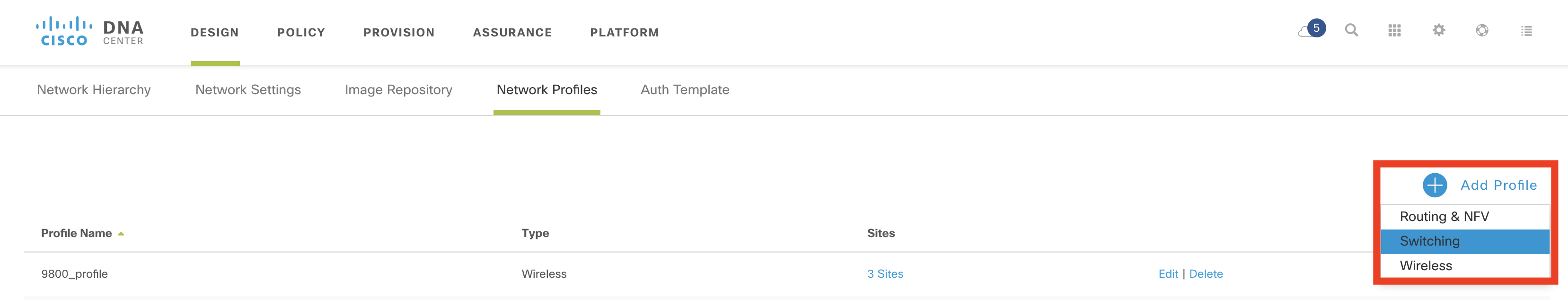 “Design -> Network Profiles” and the click on “Add Profile”. For this example I created a “Switching” profile.