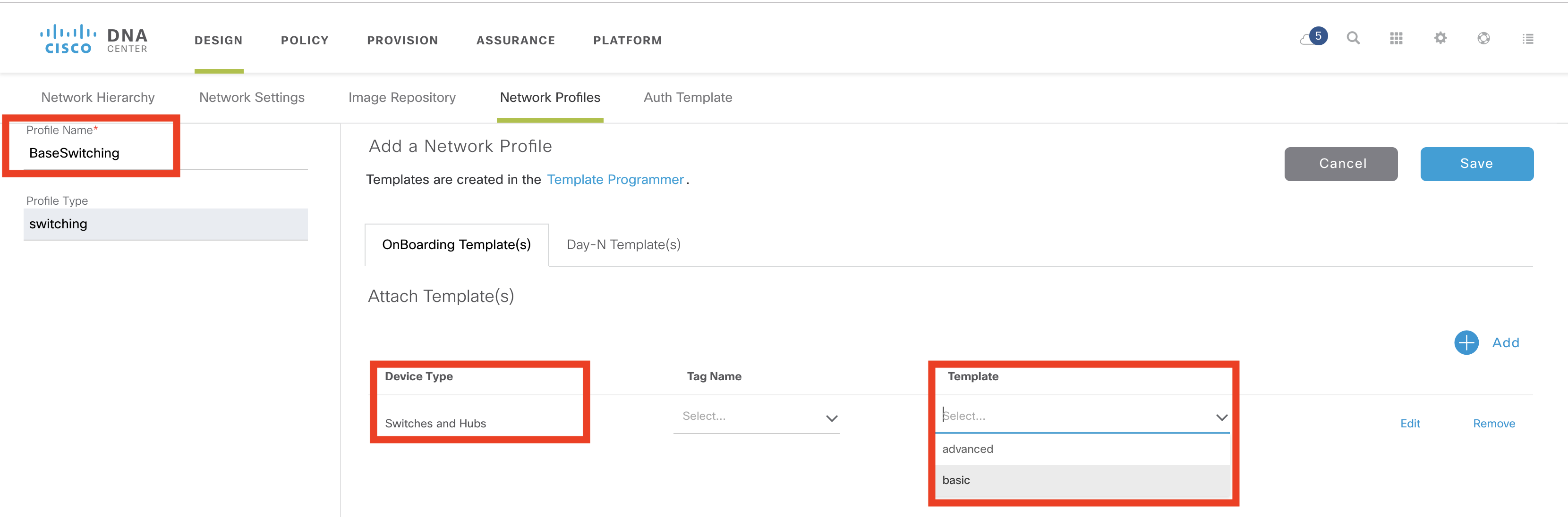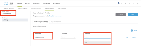 Next provide a name for the profile (I choose “BaseSwitching”), the device type “Switches and Hubs” and choose the onboarding template defined in Step 1.