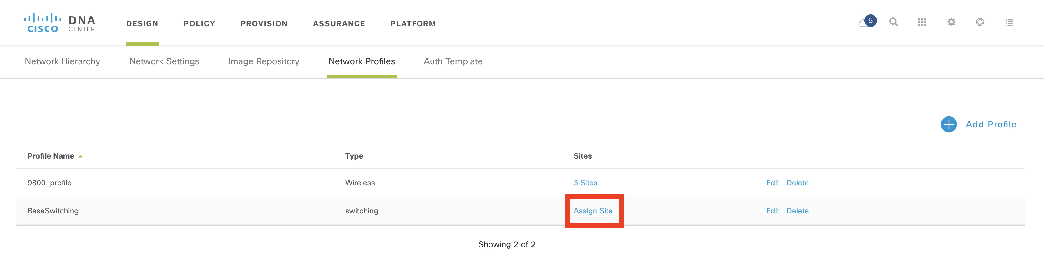 Once the Network Profile has been created, sites need to be assigned to it. Click on the “Assign Site” link for the profile.