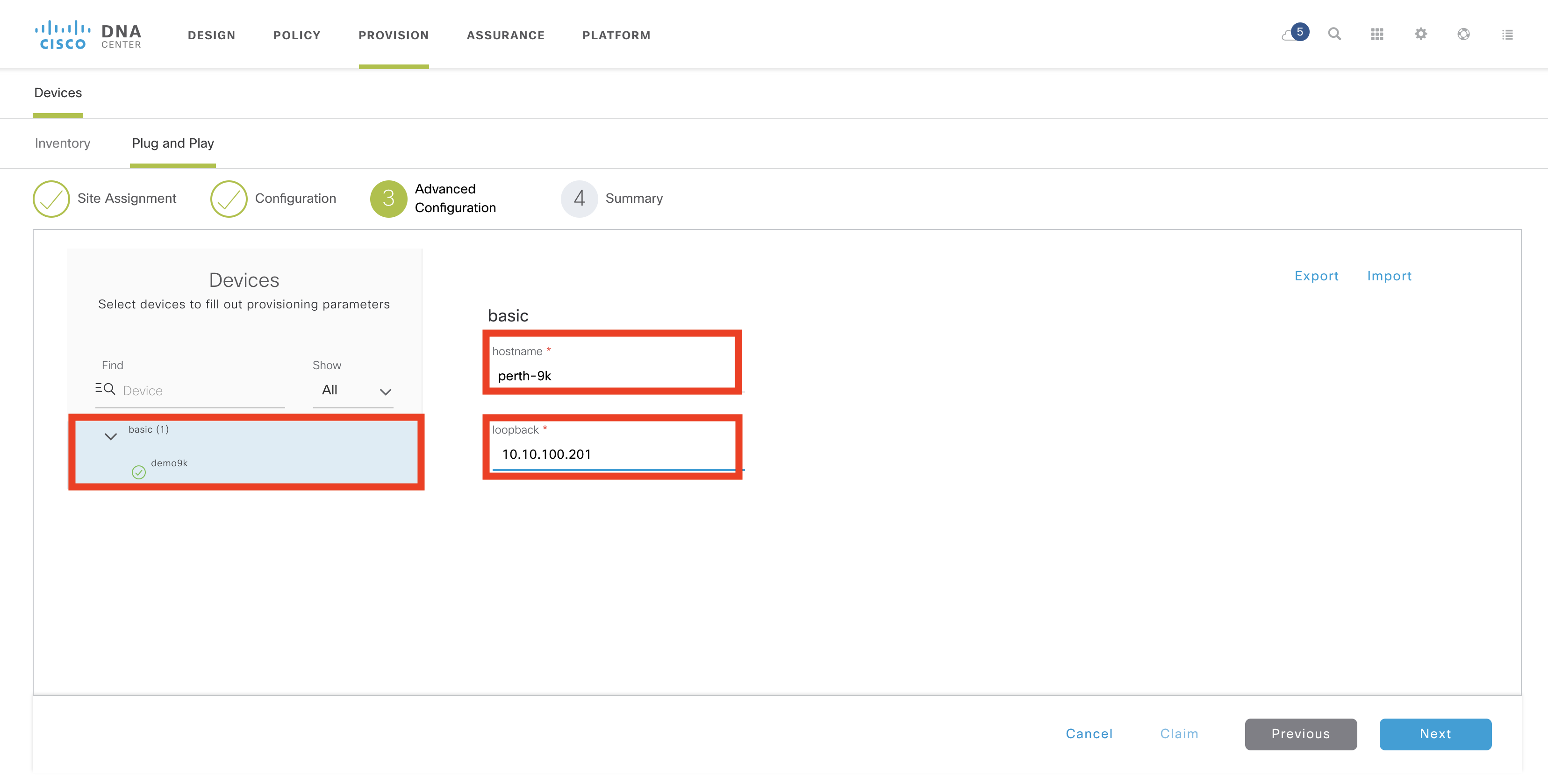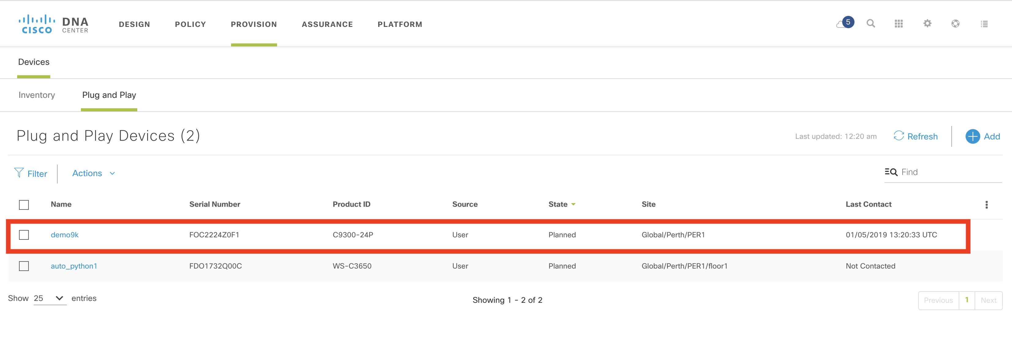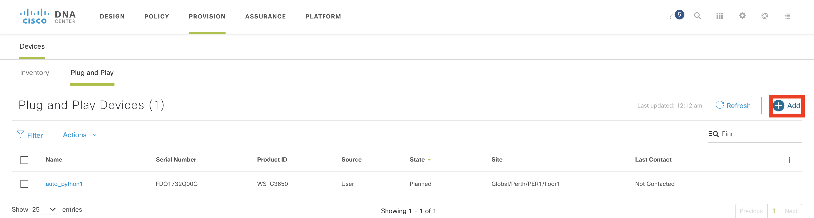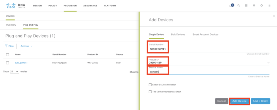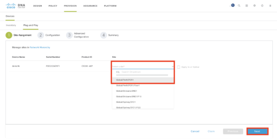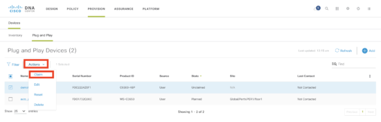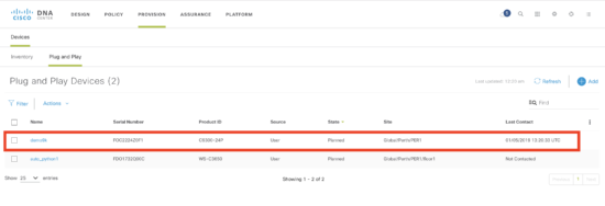 Technically, this step is optional as a device can be “pre-provisioned” where a device is added prior to being connected, or “unclaimed” where the device contacts the controller as part of the PnP discovery process (and there is no matching PnP rule). This is identical to earlier versions of Cisco DNA Center.