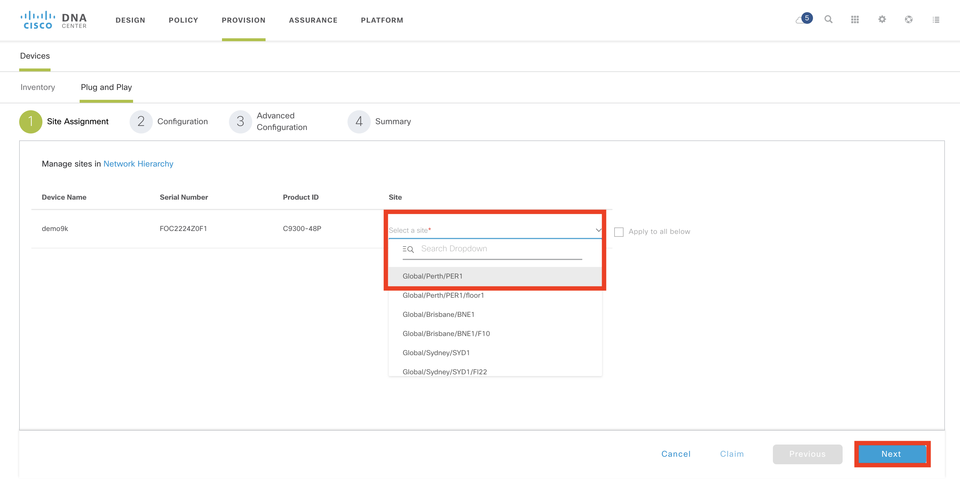 Now select a site from the list. In this example, I am selecting Global/Perth/PER1. Click Next.