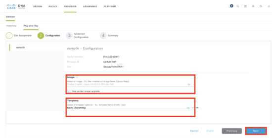 Next select the image and the template. In this example, I am skipping the image upgrade and there was only one Day0 template to choose (“basic”). Click Next.