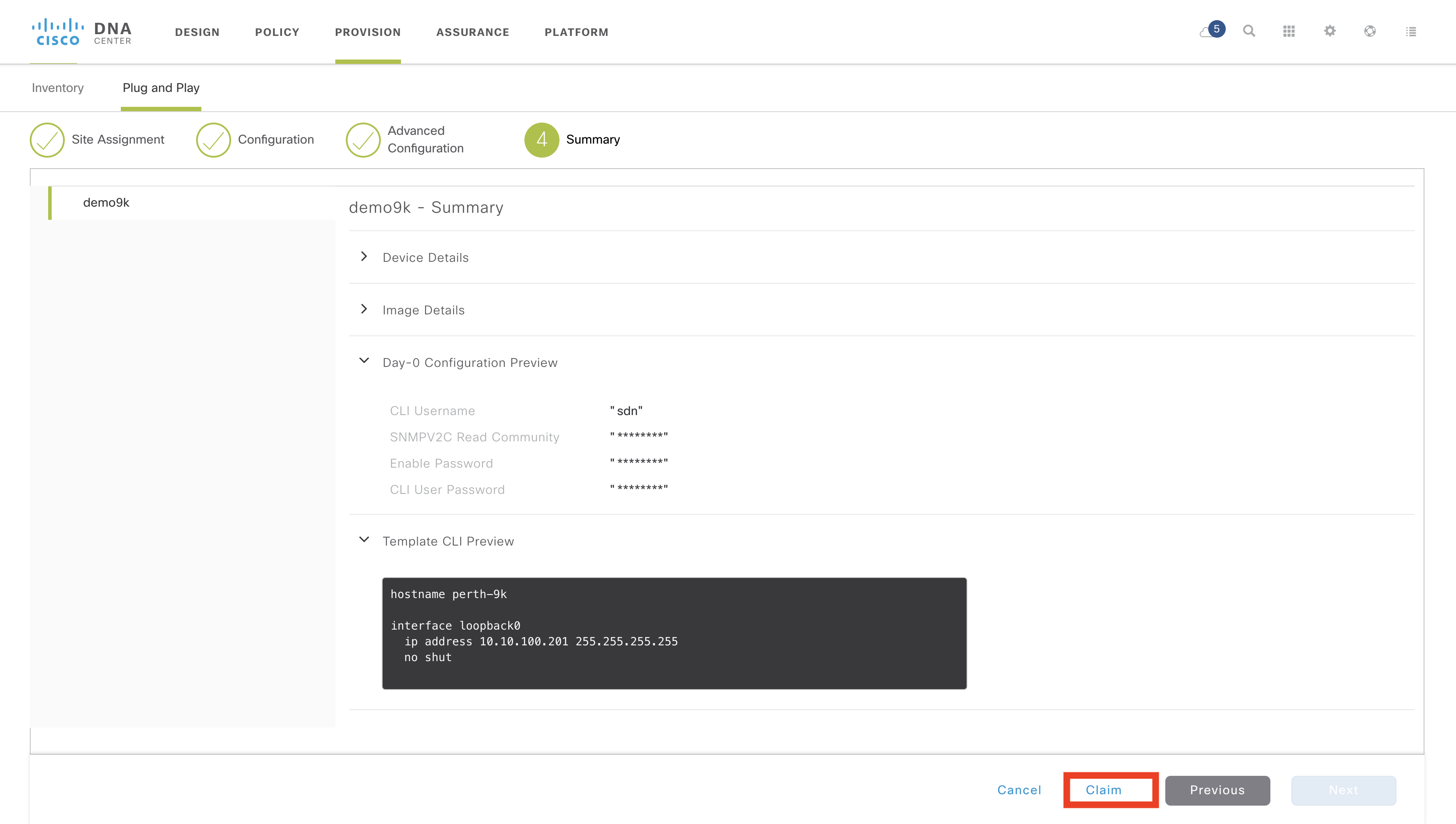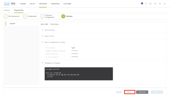 The summary page shows what will be configured on the device. I have expanded the “Day-0 Configuration” and “Template CLI preview” panes. This shows a base set of credentials and the Day0 template.