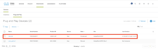 Once the device has booted up, it will contact Cisco DNA Center and be provisioned and added to the inventory. The state of the device is now “Provisioned”.
