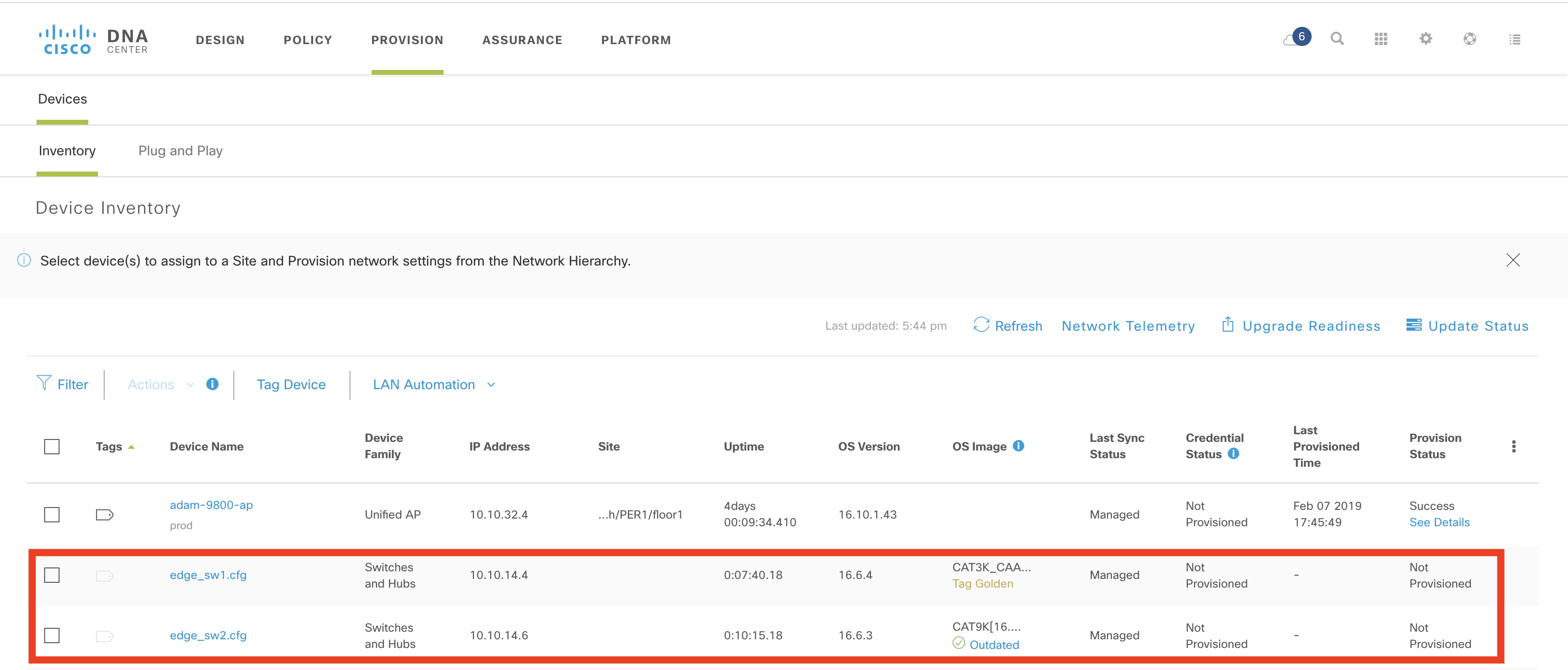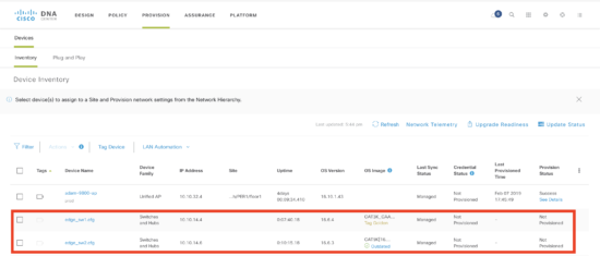 The devices have now been claimed, and the configuration file will loaded and they are added to the inventory. Note that the configuration file needs to contain credentials for DNA Center to connect and manage the device.