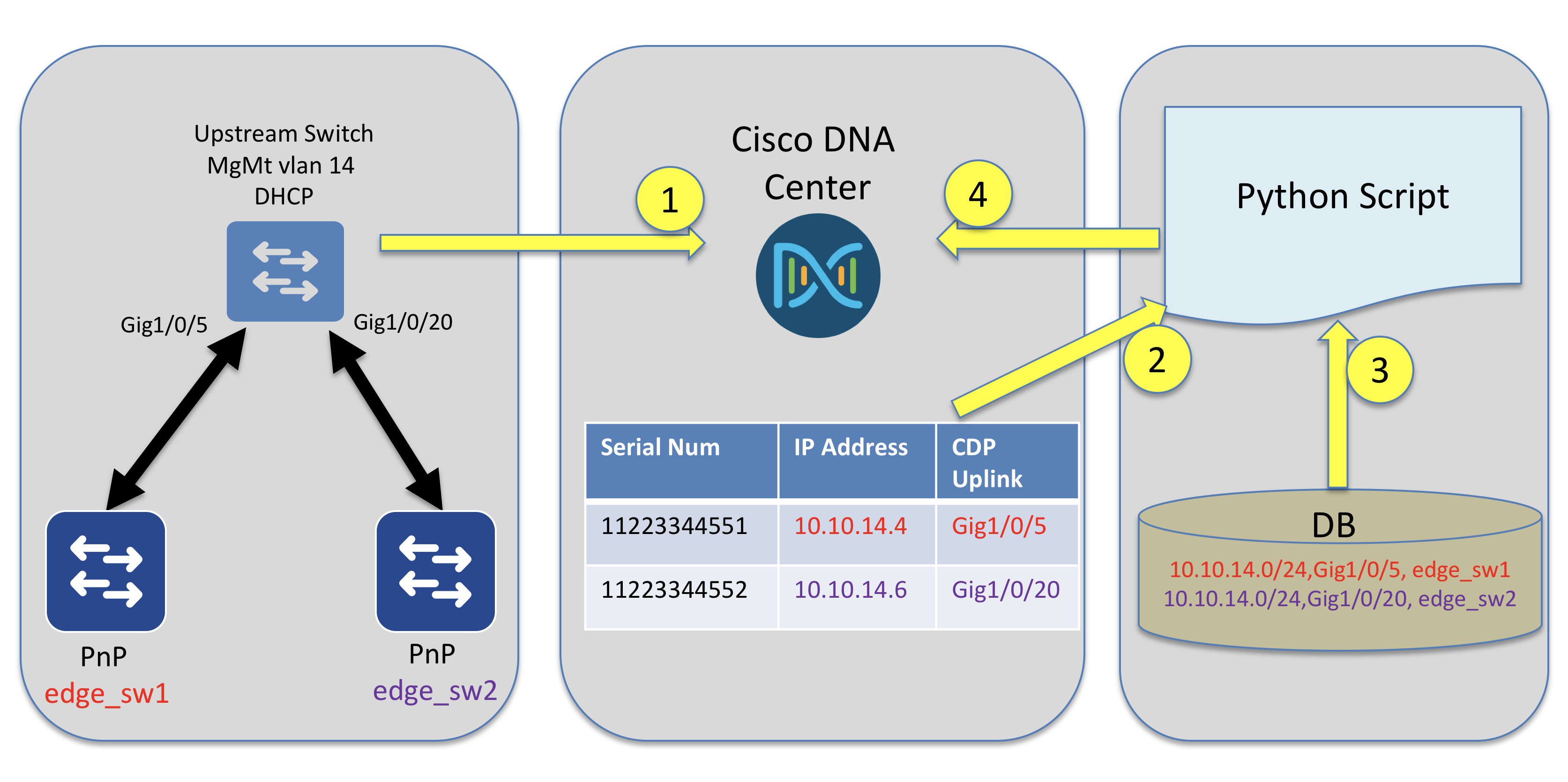 The next step is to boot the devices, so they begin the PnP process. In this scenario, I am using “pnp startup-vlan 14” on the upstream switch. This vlan has DHCP enabled and is using option 43 to direct the switches to DNA Center. Both switches are on the same vlan and will have the same IP subnet, so the upstream CDP information is going to be used to differentiate them.