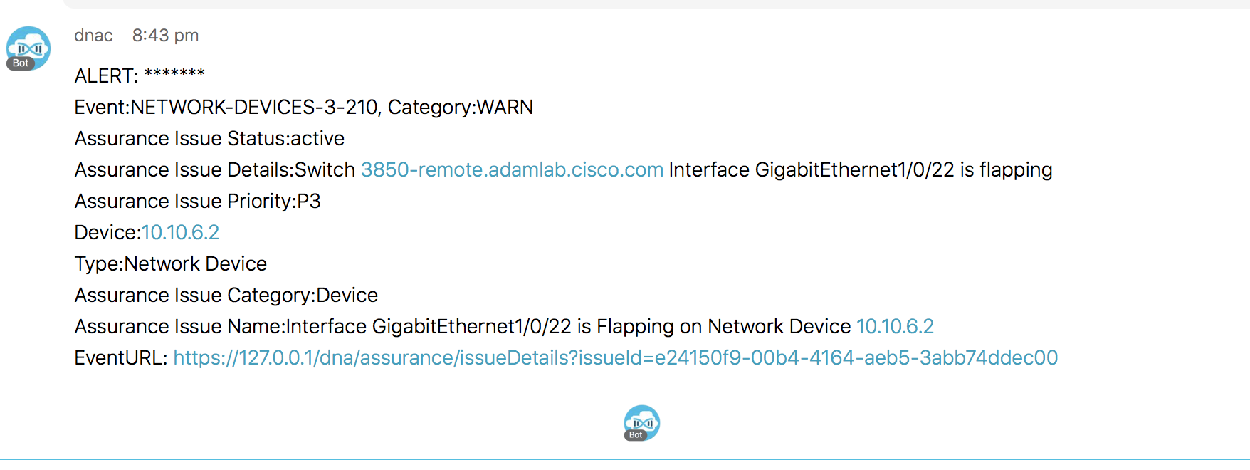 Cisco DNA center has a powerful issue correlation engine for enterprise wired and wireless networks. Taking real time feeds of network telemetry it is able to identify issues and provide context for resolution.  The next question is what to do with the events?  Some customers would like to send them to an email system, where as others would like to create a message in an instant messaging system.