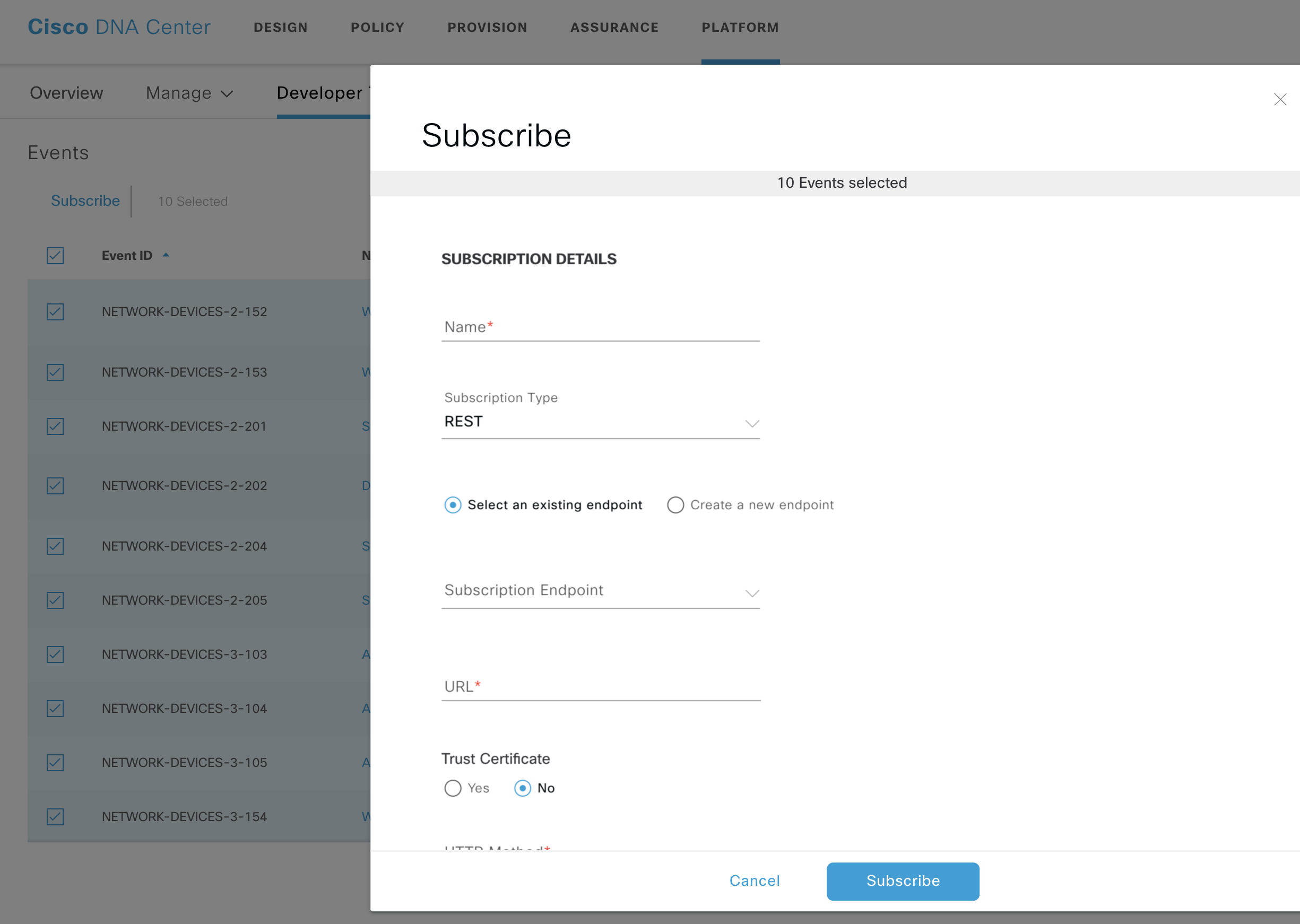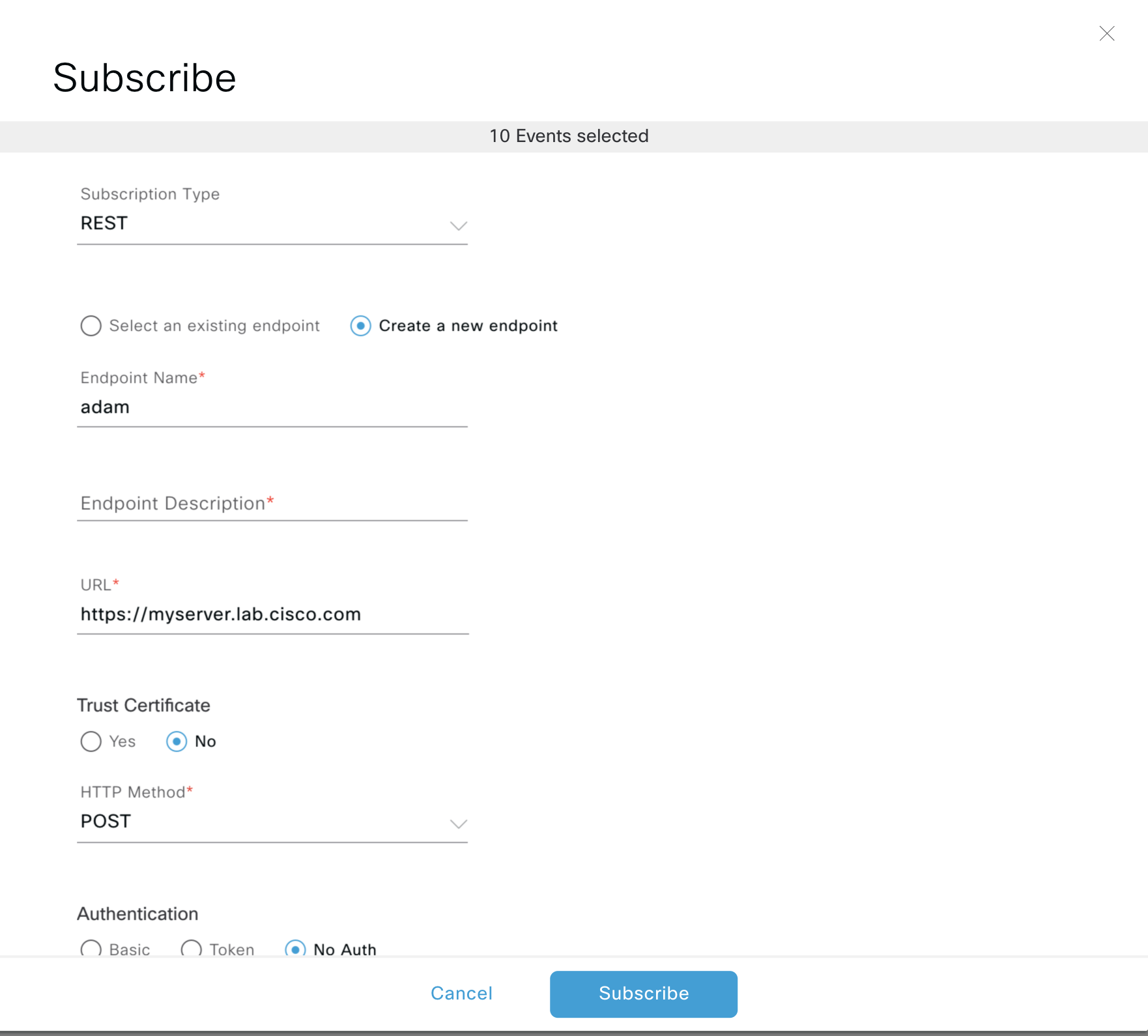 For the simple example, there is no authentication, but this is easy to add.   Click “subscribe” and the subscription will be created for the selected events.