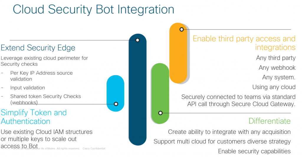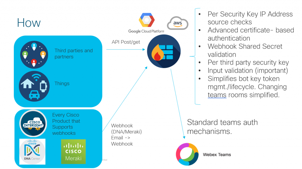 The idea was to enable cloud as an API gateway to accept requests, do advanced security checks, and decouple the Webex Teams security and context information from what is flashed onto the sensors to better manage the lifecycle. But extending this to webbooks was a natural evolution that seemed to have the most immediate impact to customers. When Demo’ing some of our cloud technologies (Intersight, Meraki), customers saw that notifications can go to webhook or email, and naturally inquired about their Webex Teams integration.