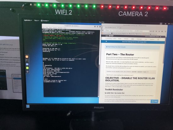We also need to make sure there are other clients bouncing on and off all the “victim” networks to enable WiFi sniffing. Due to all this, especially in high density RF environments (such as 20,000+ attendees crowding into a large concrete hall!) we found the speed of loading pages through our hacked together infra could be frustrating. Couple this with constantly joining/re-joining WiFi at different parts of the challenge and an occasional user would get confused with a “page cannot be displayed” browser error.