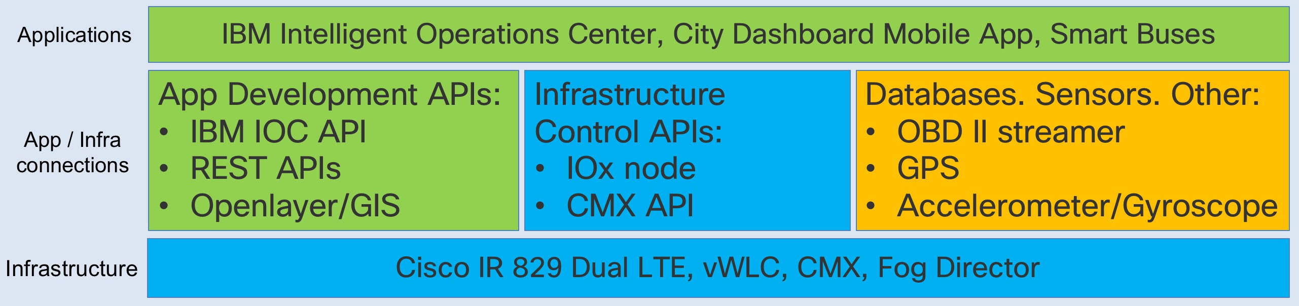 Below is a simplified architecture diagram of what the Cisco, IBM and TUB team is building in Braga. In the diagram, the green colored items are IBM items and custom development. In Blue is the Cisco platform along with its APIs. And in orange, are some additional items used in this collaborative innovation effort.