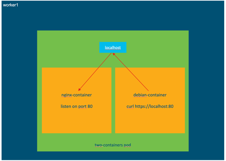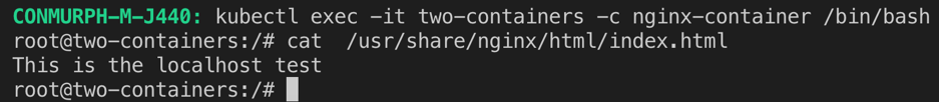 In the second scenario shared volume has been removed from the pod and a message has been written in the “index.html” file which only resides in the Nginx container. As previously mentioned, the other method for multiple containers to communicate within a pod is through the localhost interface and the port number to which they’re listening.