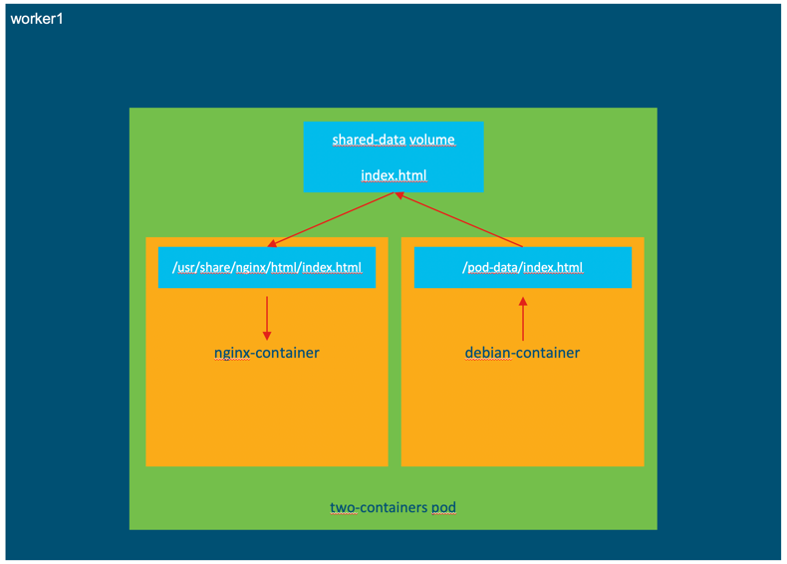 When we use the shared volume, Kubernetes will create a volume in the pod which will be mapped to both containers. In the “nginx-container”, files from the shared volume will map to the “/usr/share/nginx/html” directory, while in the “debian-container” files will map to the “/pod-data” directory. When we update the “index.html” file from the Debian container, this change will also be reflected in our Nginx container, thereby providing a mechanism for our helper (Debian) to push and pull data to and from Nginx.