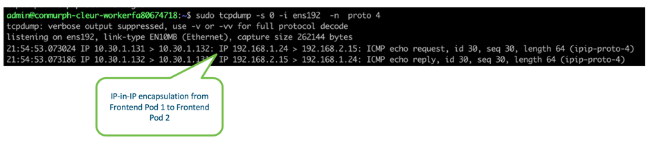 We can confirm this encapsulation is taking place by capturing the packets from the ens192 external interface. As you can see from the screenshot, when we send traffic from Frontend Pod 1 (192.168.1.24) to Frontend Pod 2 (192.168.2.15), our inner packets are encapsulated in an outer packet containing the external source and destination addresses of the ens192 interfaces (10.30.1.131 and 10.30.1.132).
