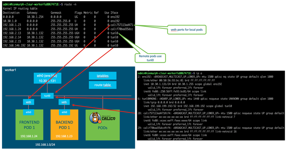 Any time we need to send traffic from a pod on worker 1 (192.168.1.x) to a pod on worker 2 (192.168.2.x) we will send it to the tunl0 interface.