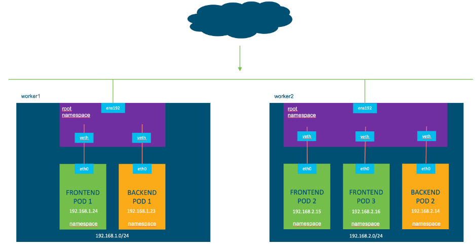 Additionally, each Kubernetes node has a default or root networking namespace (VRF) which contains for example the external interface (ens192) of the Kubernetes node.