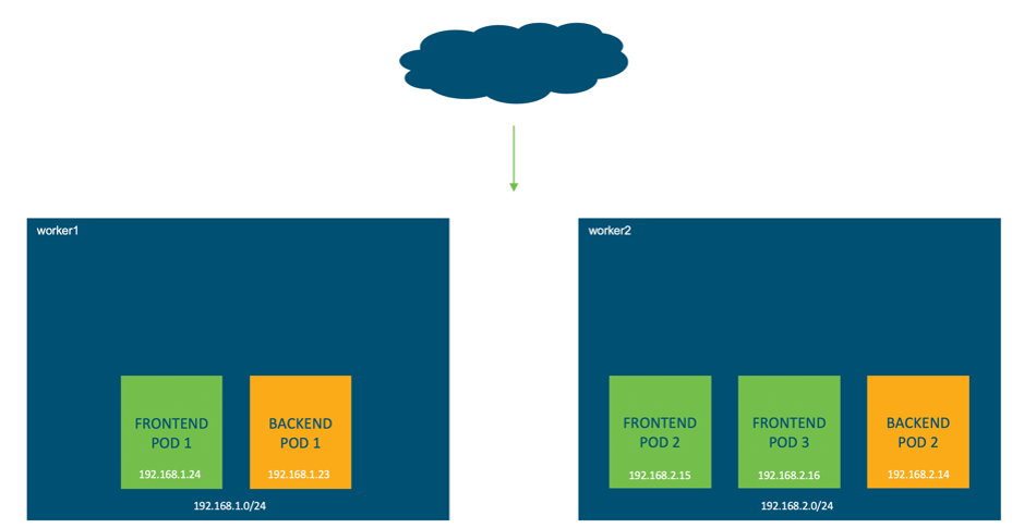 - Each node receives it’s own /24 subnet, worker 1 is 192.168.1.0/24 and worker 2 is 192.168.2.0/24.