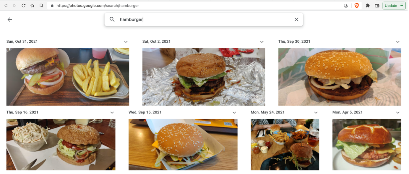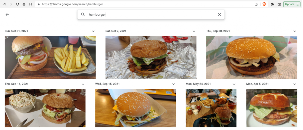 If you upload your photos taken from your smartphone camera to your Google account (like I do), you can search your photos by keyword. See the screenshot below from my Google account, of all the hamburgers I have eaten: