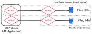 Figure 2 shows that each MCP-C instance has a one-to-one connection to each MCP-S instance. In the figure, there are two MCP clients running on the MCP host, an AI agent in this example. The first MCP client is connecting to a locally-hosted MCP server that provides local machine file system access. The second MCP client is connecting to a remotely hosted MCP server that is providing access to a remote file system.