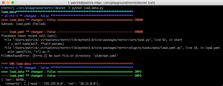 I know what you are thinking, why aren’t they using IPv6? Remember, all this played out a long time ago. Our first goal is to load the data from these files so that it’s associated with each of the hosts from that site. There is a plugin to read YAML files in Nornir which we are going to use. We do however need to write a bit of code to tie it together. Let’s take a look!
