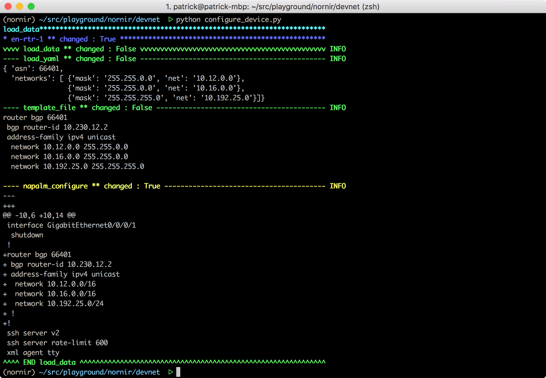 While learning about network automation chances are that you’ve crossed paths with Vagrant which is a great tool when testing and learning. It lets you create a virtual router on the fly to run tests. If you haven’t tried Vagrant, I strongly recommend that you do so. Above I relied upon the DNS entries for each host and connected to the default ports. To use the napalm_configure task against a device running in Vagrant you would have to make a small modification to the inventory. An example would look like this:
