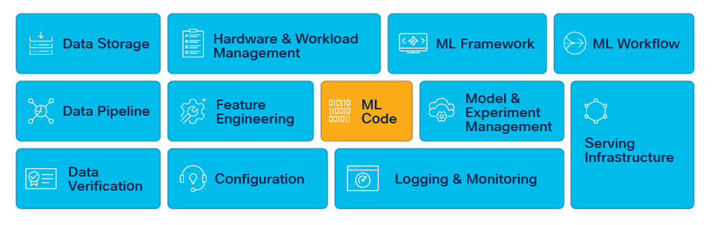 This has been discussed and visualized in the popular NeurIPS paper, Hidden Technical Debt in Machine Learning Systems, by David Sculley and others in 2015. The paper emphasizes that it’s important to be aware of the ML system as a whole, and not to get tunnel vision and only focus on the actual ML code. Inconsistent data pipelines, unorganized model management, a lack of model performance measurement history, and long testing times for trying newly introduced algorithms can lead to higher costs and delays when creating ML-based applications.