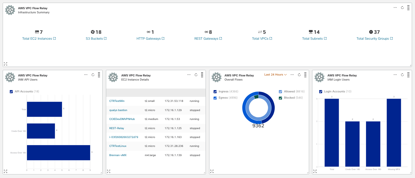 The five tiles available provide metrics on the overall infrastructure, VPC flows, EC2 instances, and IAM credentials. All links even pivot to the appropriate resources, reducing the time from detection to mitigation significantly.