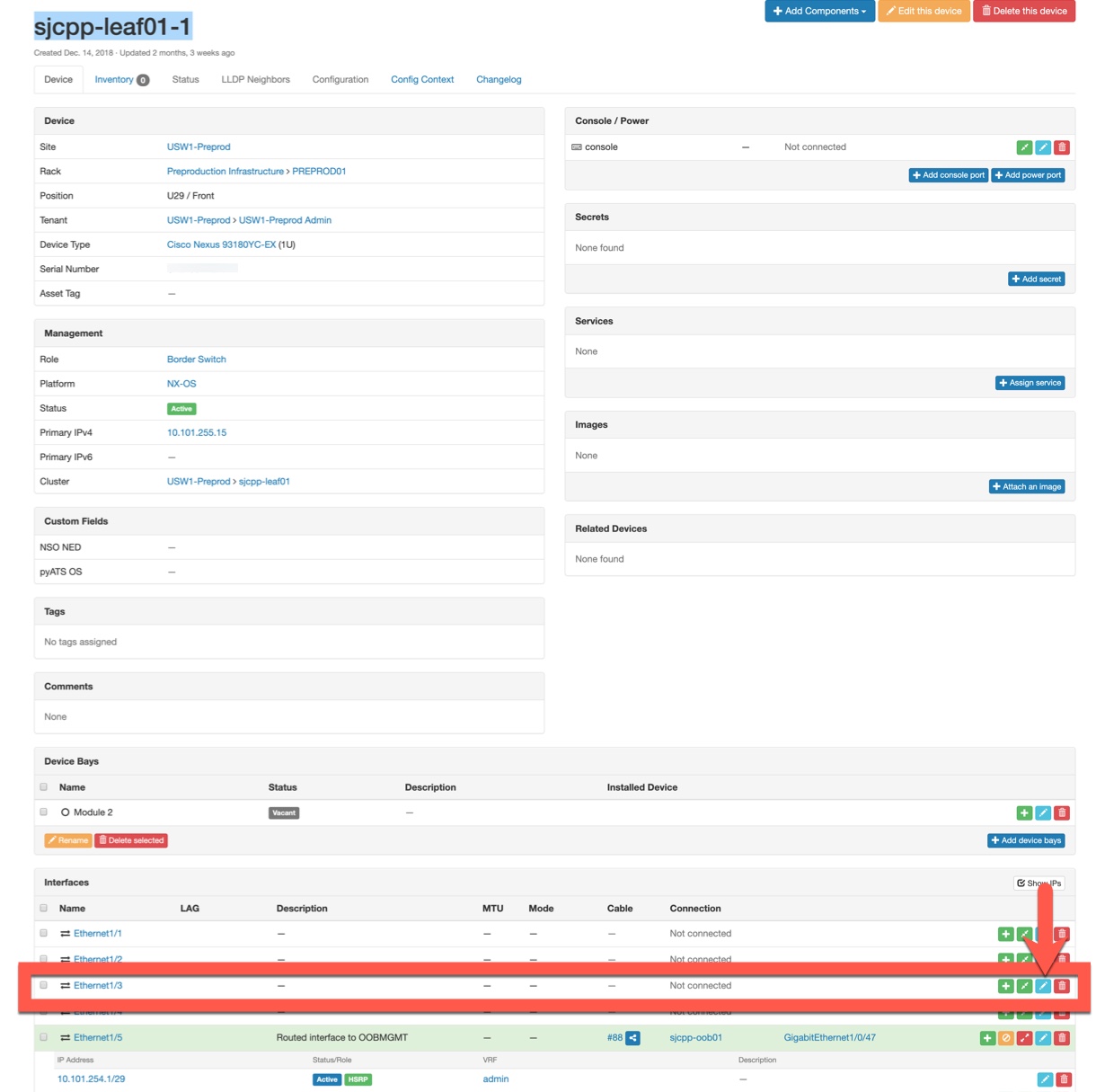 I navigate in Netbox to the device details page for the relevant switch. At the bottom of the page are all the interfaces on the device. I find interface Ethernet 1/3 and click the “Edit” button.