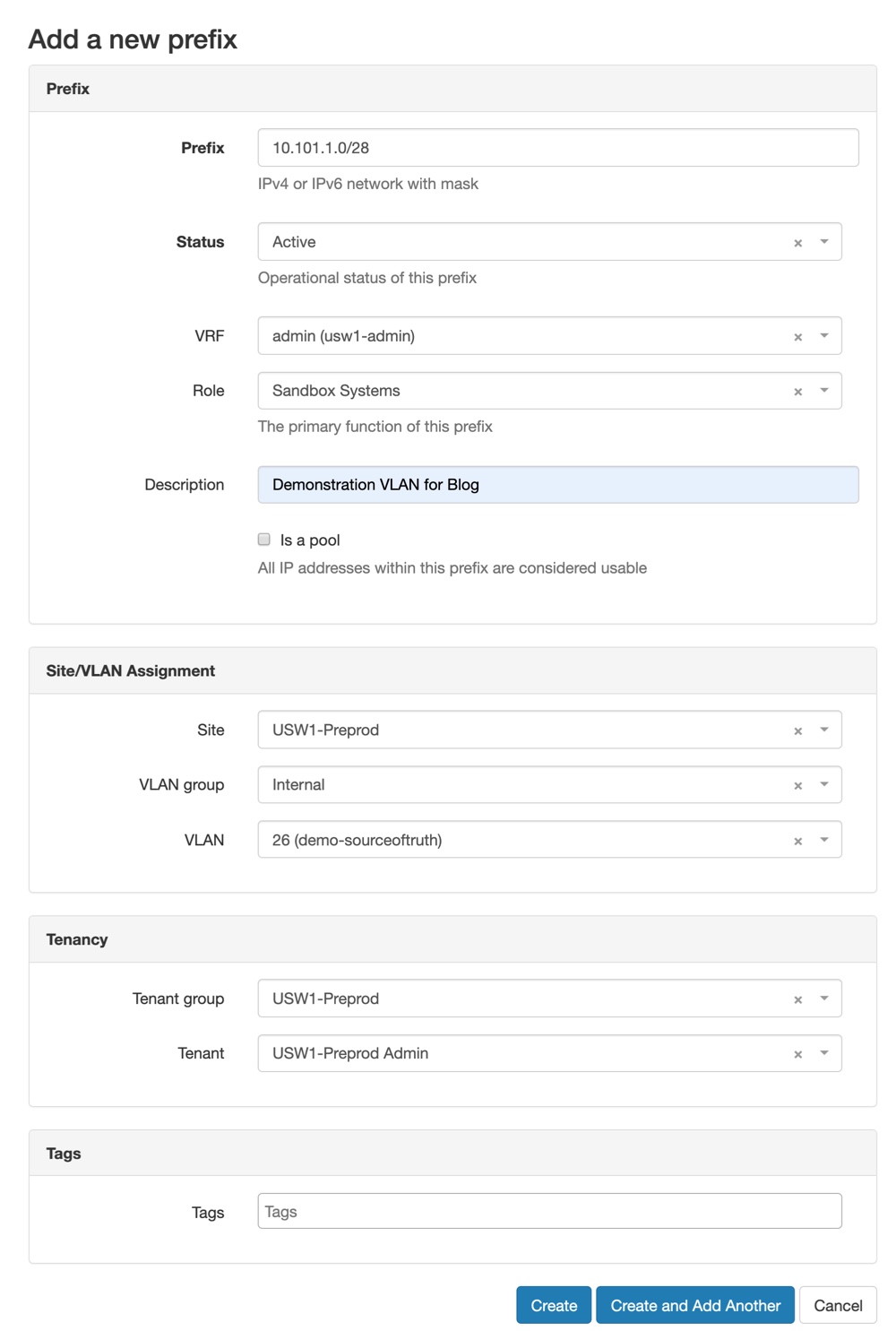 I start by updating the Prefix to be the proper size I want, picking the Role (this matches the VLAN role), providing a good description so folks know what this is for. I then choose the new VLAN we just created to associate this prefix to using the drop downs and search options provided in the UI. Lastly I pick the Admin tenant and click “Create”