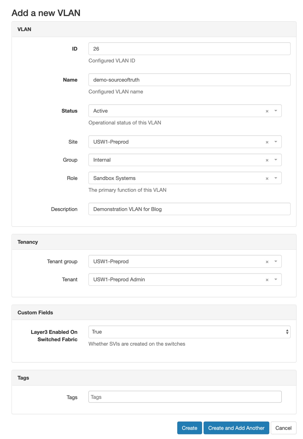 I provide the new name for this network, and indicate it’s role will be for “Sandbox Systems”. As this new network will be part of the Admin Tenant, I select the proper Group and Tenant from the drop downs. Netbox supports creating custom fields for data that you need, and we’ve created a field called “Layer3 Enabled on Switched Fabric” to indicate whether SVIs should be setup for a network. In this case that is True. After providing the details, I click “Create” to create this new VLAN.