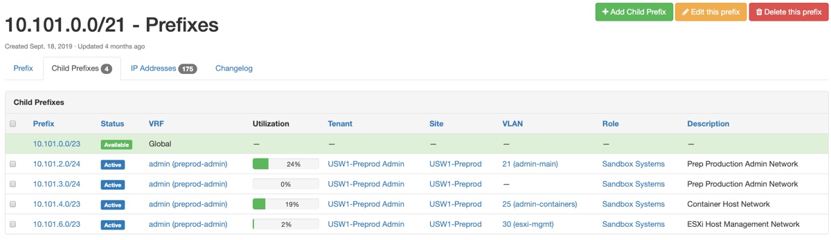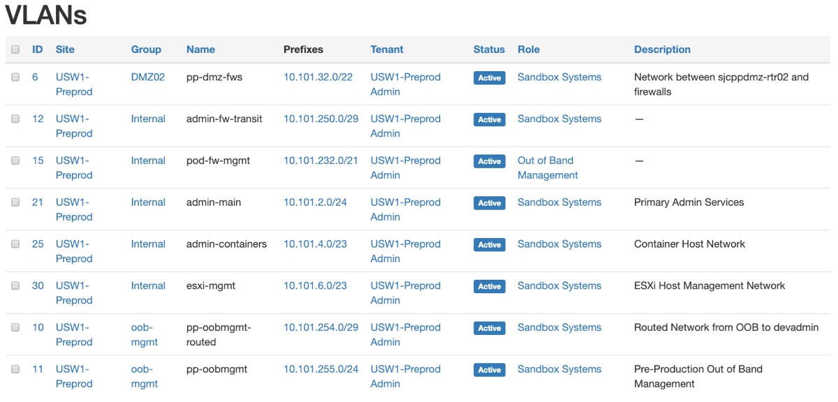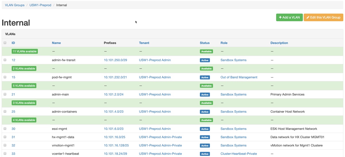 The “Group” column represents the VLAN Group in Netbox – which is a way to organize VLANs that are part of the same switching domain where a particular VLAN id has significance. This new network will be in the “Internal” group. I click on “Internal” on any of the VLANs to quickly jump to that part of Netbox so I can find an available VLAN id to use.