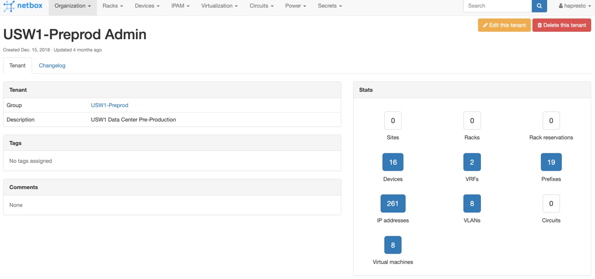 I start in Netbox at the Tenant view for our Admin environment. From here I can easily view all the DCIM and IPAM details for this environment.