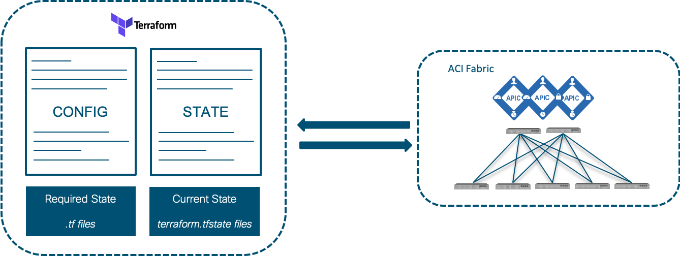 Cross checking the configuration file against the resources (e.g. ACI fabric), reduces the amount of configuration drift since Terraform will create/update/delete the infrastructure to match what’s written in the config file.