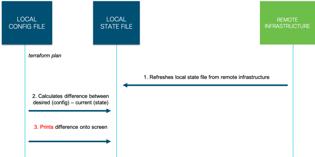 This command is a convenient way to check whether the execution plan for a set of changes matches your expectations without making any changes to real resources or to the state. For example, terraform plan might be run before committing a change to version control, to create confidence that it will behave as expected.