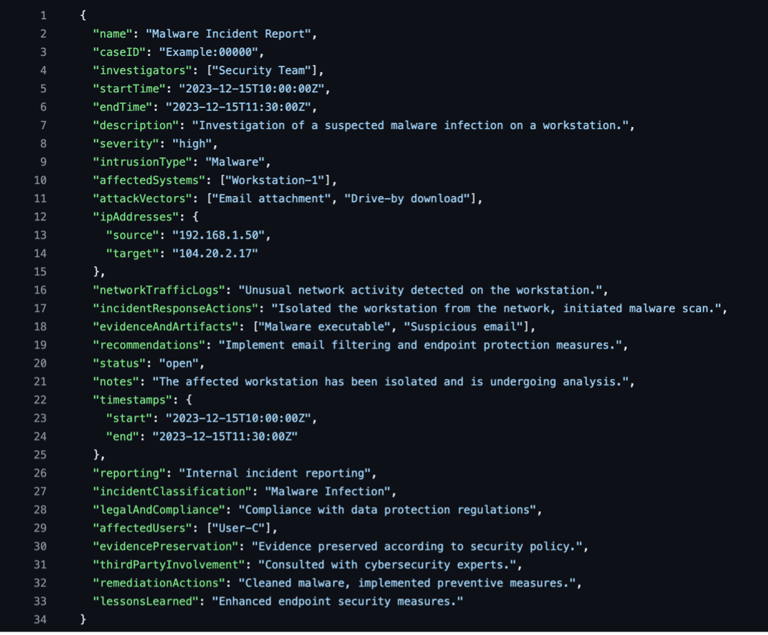 From this point we will switch to a hands-on mode and invite you to ‘git clone git@github.com:geoffhendrey/cop-examples.git’. After cloning the repo, take a look at https://github.com/geoffhendrey/cop-examples/blob/main/example/knowledge-store-investigation/README.md which offers a detailed step-by-step guide on how to define a network intrusion Type in the JSON store and how to populate it with a set of default values for an investigation. Shown below is an example of a malware investigation that can be stored in the knowledge store.