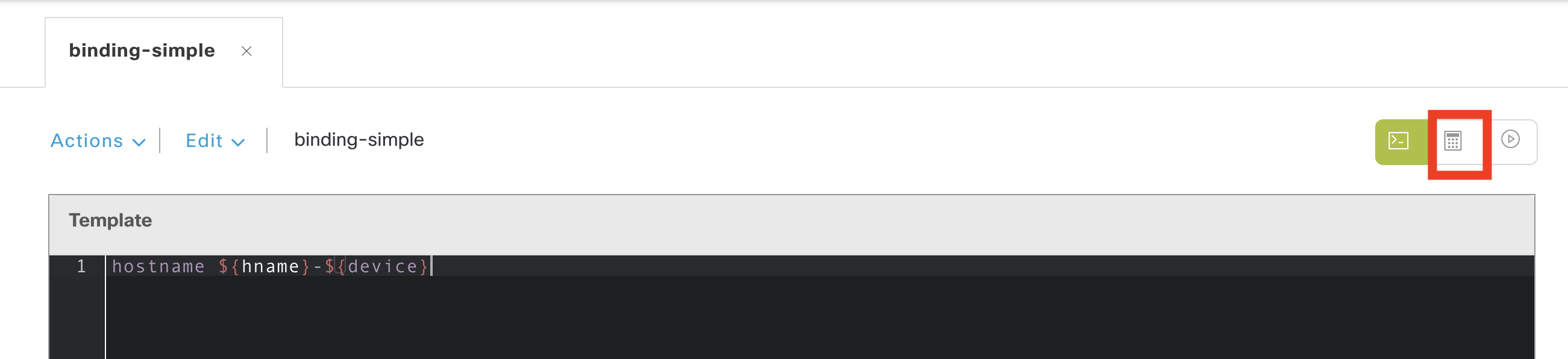 It is possible to access information about the device (from DNAC perspective) using a binding. Attributes about the device, such as it’s model number can by linked to a variable. For example in the following template I want to set ${device} to the device product ID (PID) from the inventory.