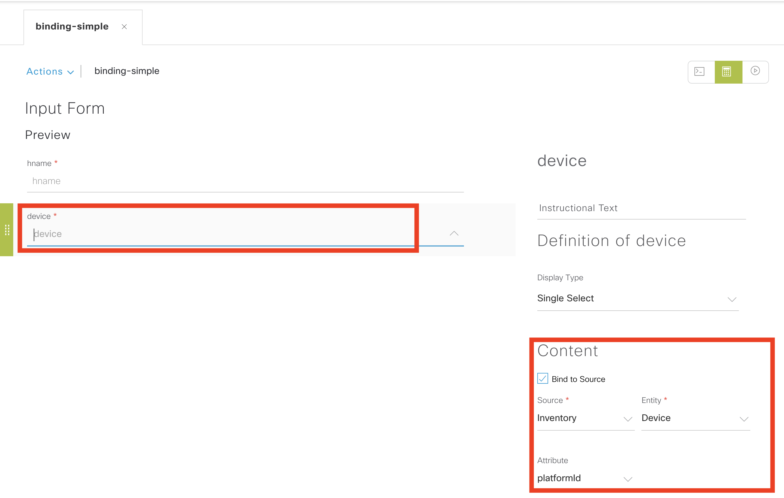 Then click the variable (device) and bind to source (bottom right). Select Source = “Inventory”, Entity = “Device” and Attribute = “platformId”. This indicates this variable should come from the inventory, specifically data about the device. The attribute is optional, but in this case just the “platformId” (model number) is required. For a stack this will be a comma separated list.