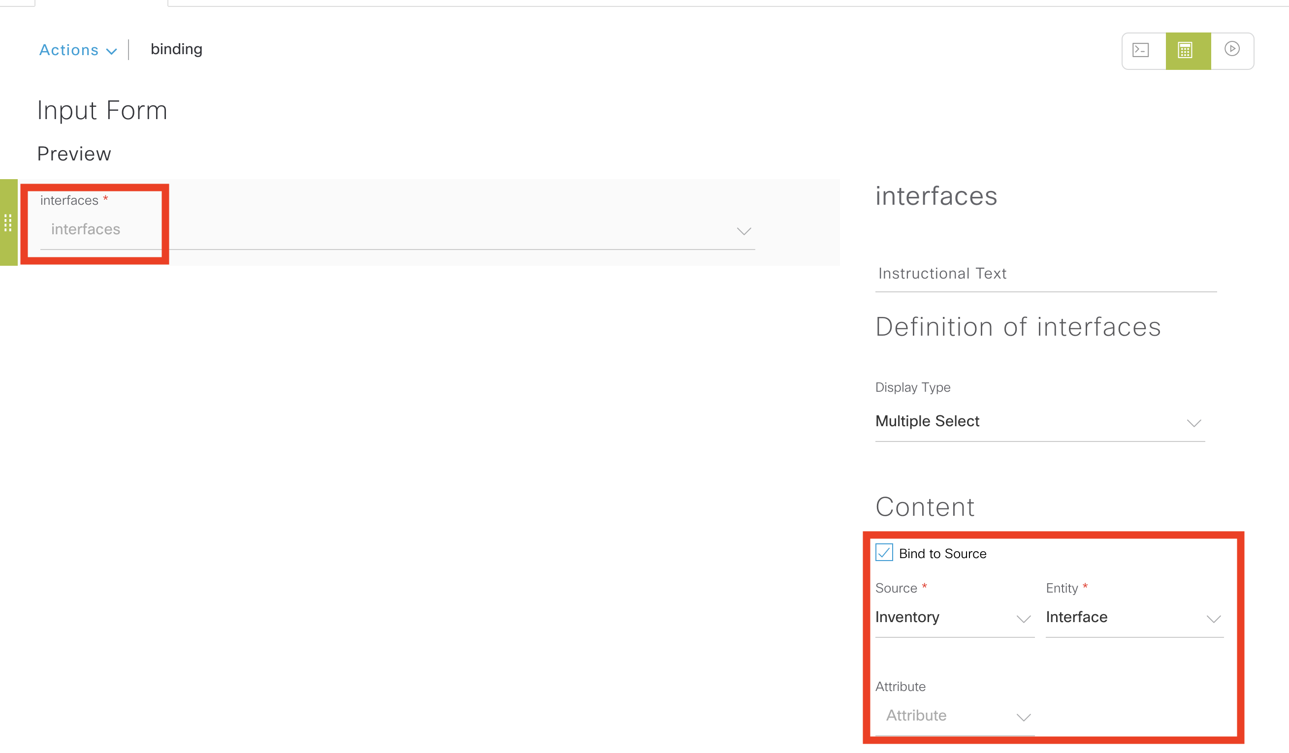 To define the binding, click on the variable definition icon in the template (as in the earlier blog). Again, it is bind to source. The source is “inventory” and this time the entity is “interface”. No attributes are selected, which means all of them are provided to the template.