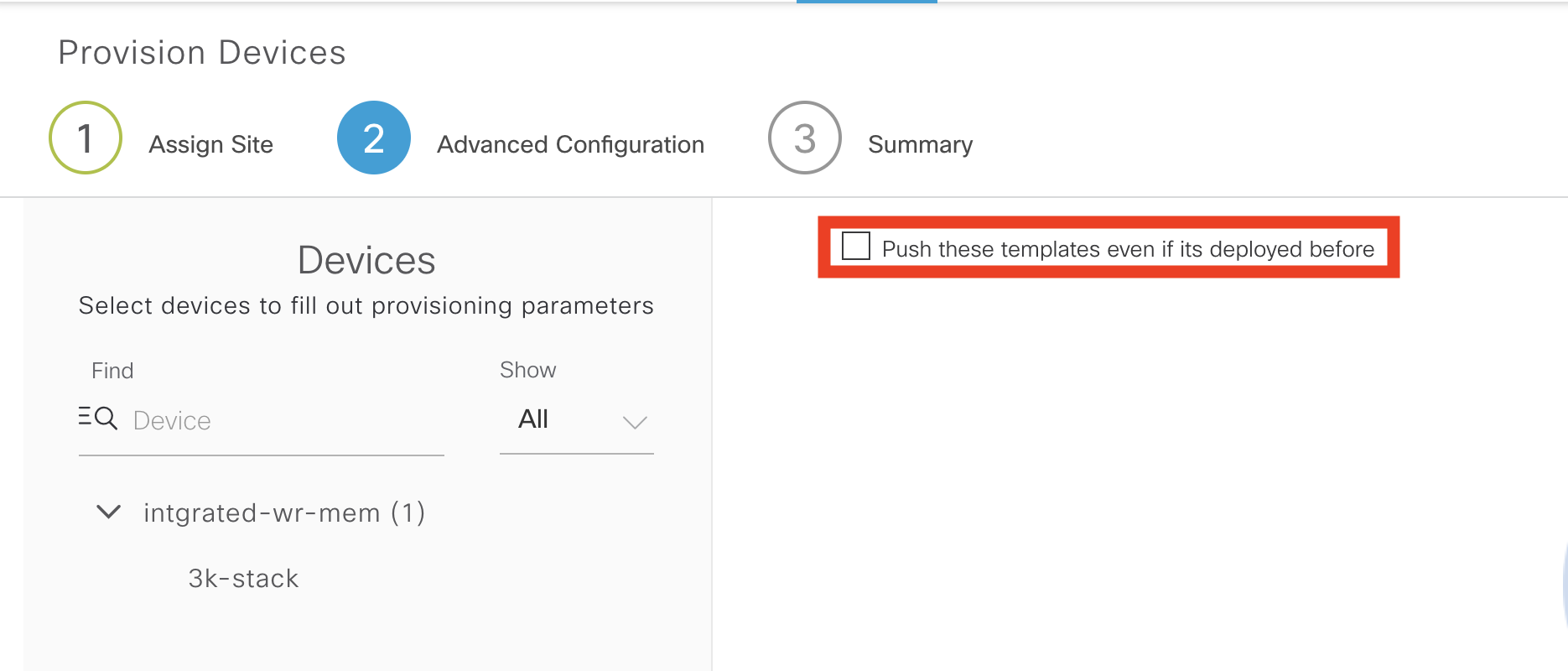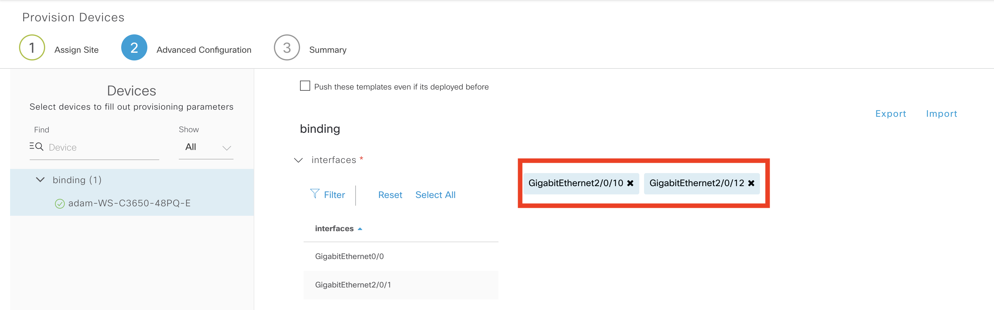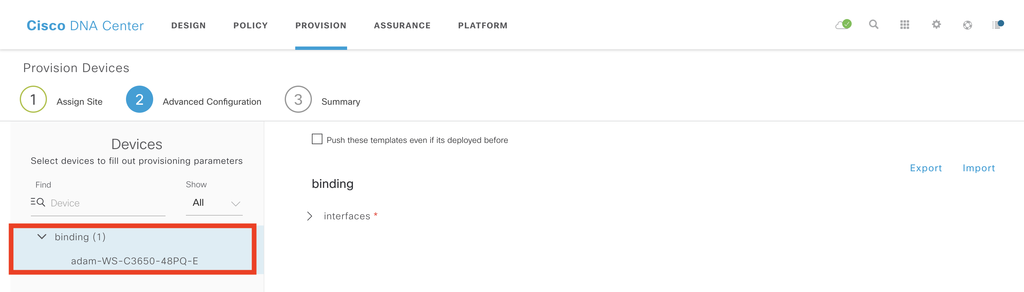 To deploy this template, goto inventory, select a device then choose provision. It is assumed the site profile has been created and the template added to the profile. When you see “Advanced Config” select your device (in this case adam-WS-C3650-48PQ-E).