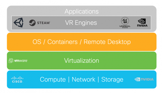 The VR Cloud is based on HyperFlex, Cisco’s Hyperconverged Infrastructure (HCI). This provides highly scalable compute and networking capabilities including the latest generation of nVidia Tesla v100 GPUs. An integral component of HCI is the virtualisation layer, in this instance it is provided by VMware ESX. The next abstraction is the Operating systems, containers and remote desktops delivering control plane and VR sessions to remote users. The next abstraction are the VR engines. You have a choice of leading VR engines such as Unity, Unreal and OpenVR and Holodeck.