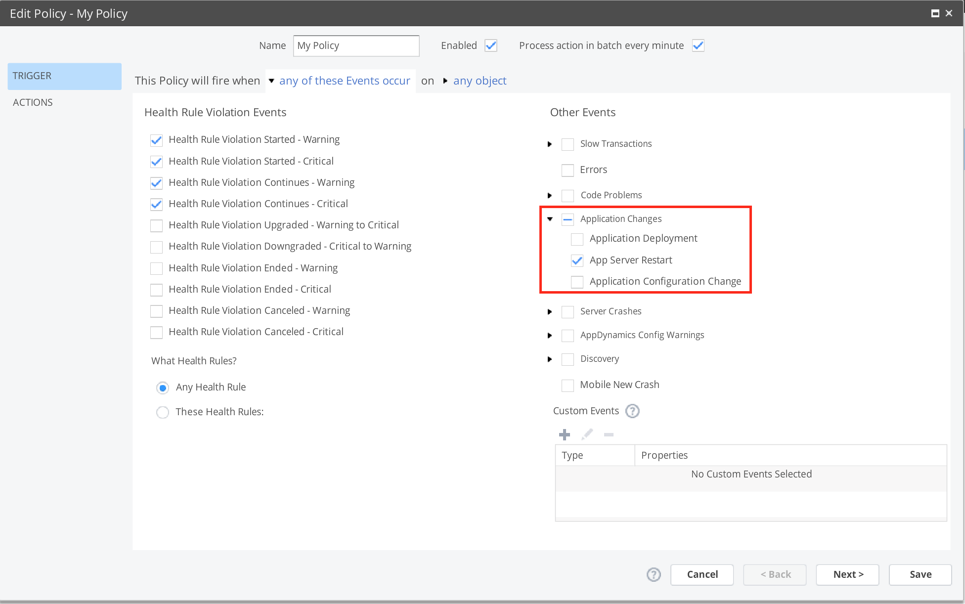 The monitoring criteria can be performance metrics, health rules related to business transaction performance or specific events like a server restart. It can really be anything you like. For example, say some of your business transactions start slowing down to unacceptable level. Trigger the alert! For the sake of simplicity, I’ve decided to go with a simple server restart.