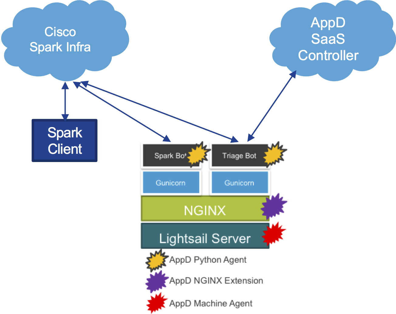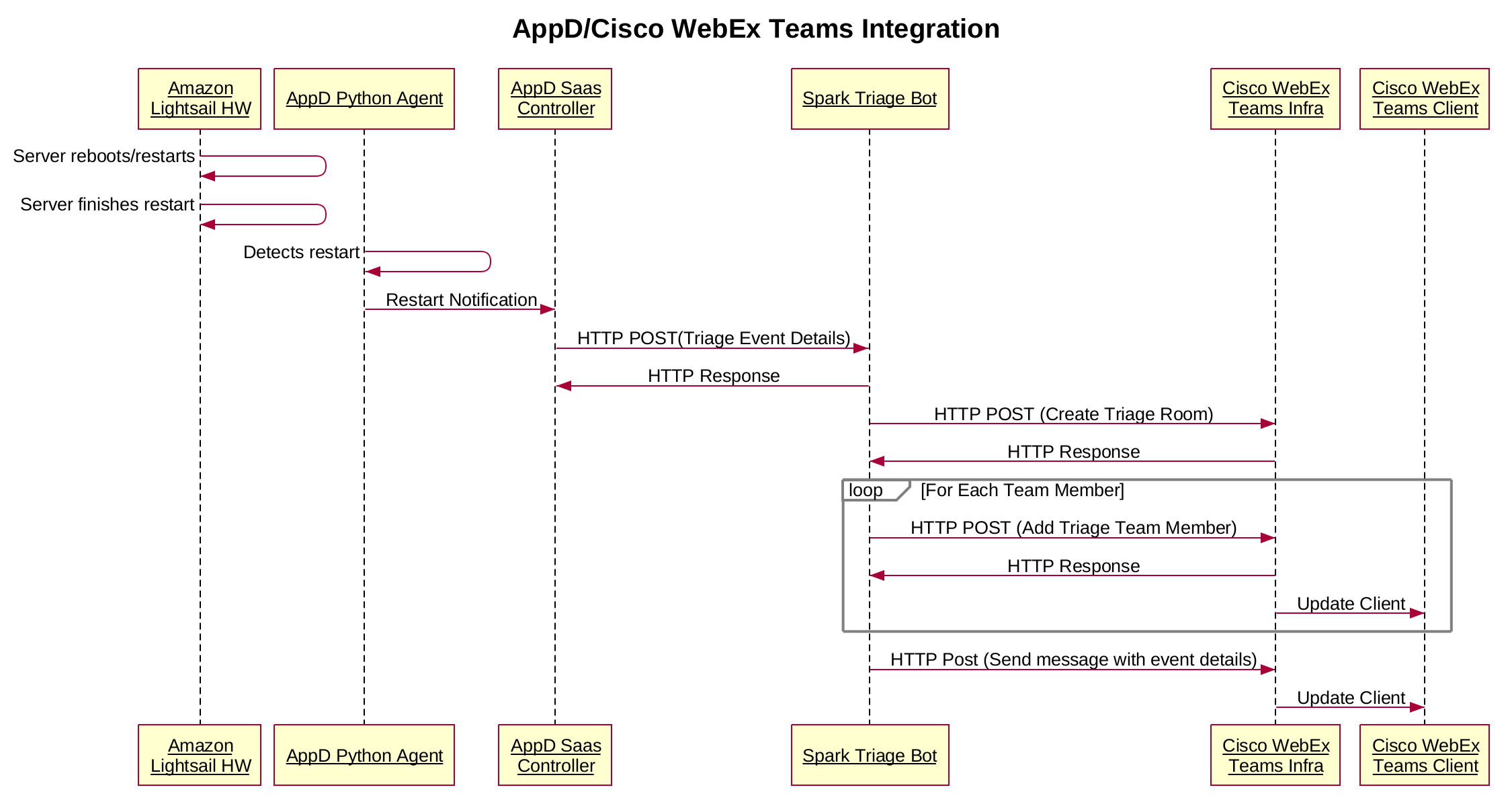 I already have AppD monitoring a couple of my own Webex Teams Bots, so let’s setup App Dynamics and a Webex Teams Bot to do the following in case a server I’m monitoring restarts. Here is a high level view of the architecture.