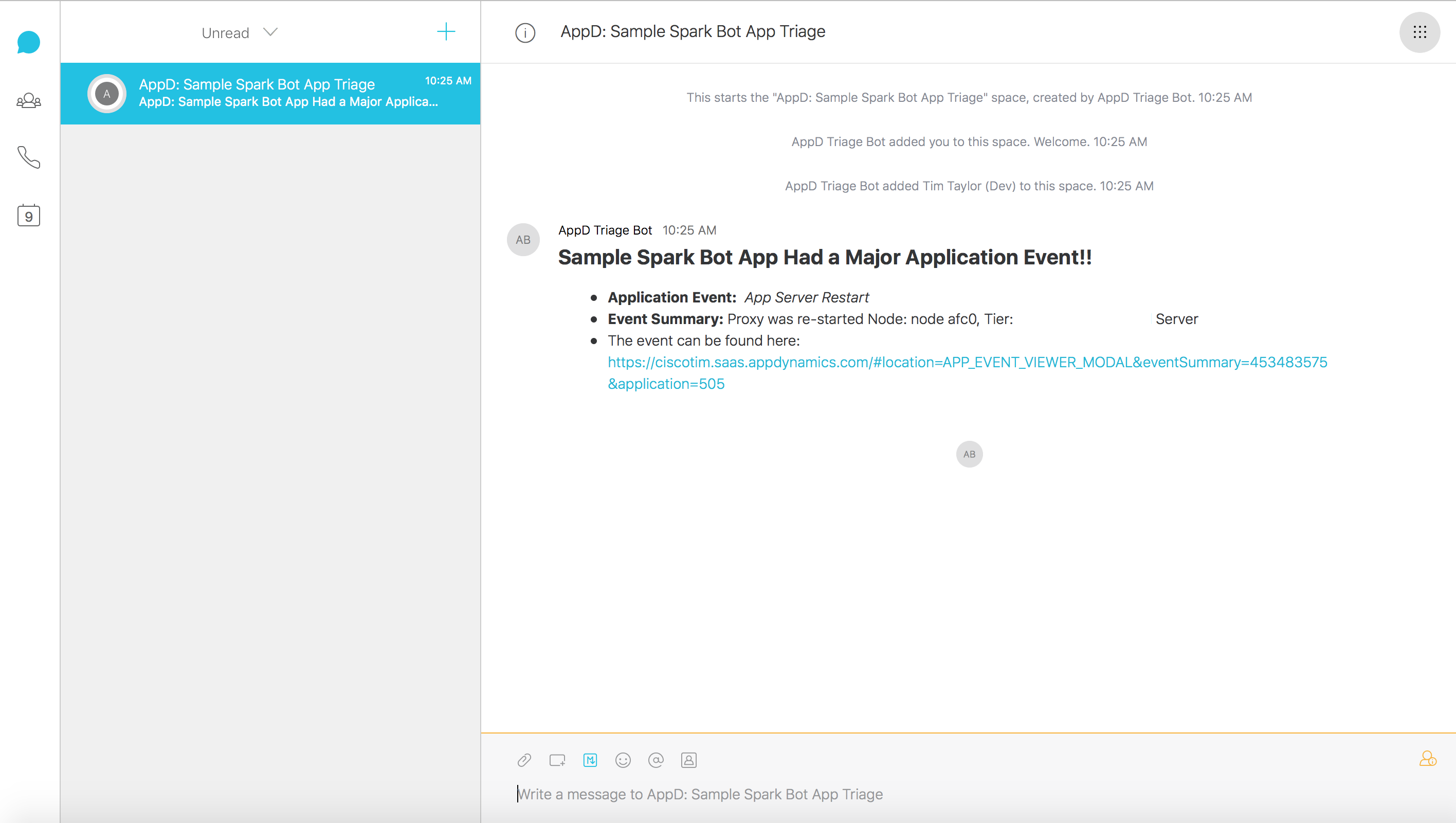- Post to the space an informative message with a deep link back to the AppD Controller so that the team can dive right in and start troubleshooting.